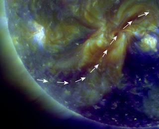 Ένα μεγάλο ρήγμα -διαταραχή στο μαγνητικό πεδίο του Ήλιου- παρακολουθούν οι επιστήμονες εδώ και τουλάχιστον 4 ημέρες. Το ρήγμα, που εμφανίστηκε στις αρχές Απριλίου, υπολογίζεται πως έχει μήκος τουλάχιστον 700.000 χιλιόμετρα, σχεδόν η διπλάσια απόσταση που χωρίζει τη Γη από τη Σελήνη.